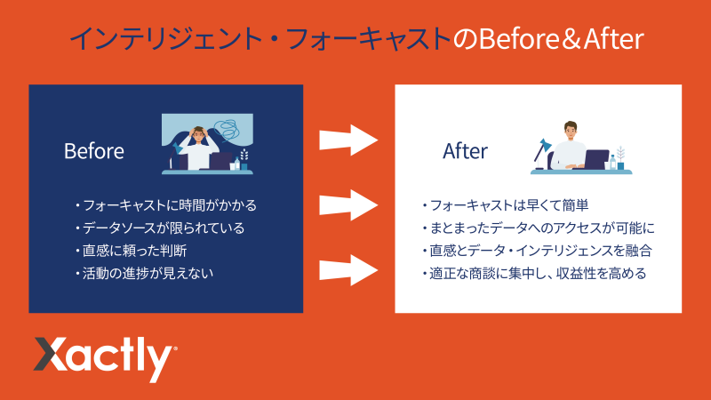 だからこそ、インテリジェント・フォーキャスト・テクノロジーをセールスプロセスに活用することが、毎回の売上予測とその後の最適化を可能な限り正確かつ透明性のあるものにするための最良の方法なのです。ここでは、インテリジェント・フォーキャスト・ソリューションを導入する前と後では、売上予測の方法がどのように変わるかを見てみましょう。