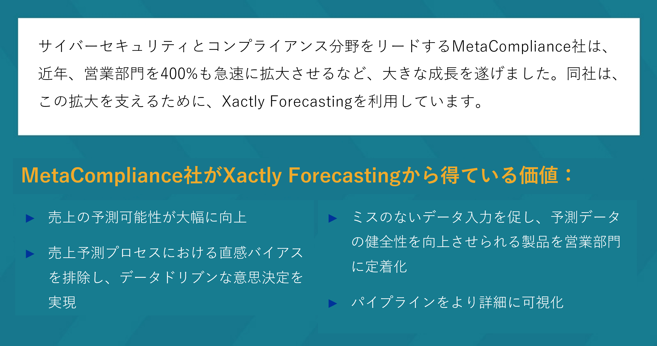 Xactlyのお客様であるMetaCompliance社が、インテリジェント予測ソフトウェアを導入し、売上目標の達成率を向上させるだけでなく、更なる効果も享受できた事例をご覧になってください。