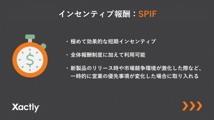 SPIF(Sales Performance Incentive Fund:販売実績インセンティブ基金)は、効果的な短期インセンティブです。製品リリース時や市場競争環境が激化した際など、一定期間のみ優先事項を変えてもらうために、営業報酬制度に加えて取り入れることが推奨されます。