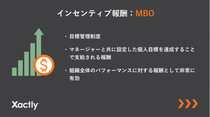 MBO(Management by Objectives:目標による管理)とは、営業部門以外の従業員を含め、組織内のさまざまな役職の従業員にインセンティブを与えられる優れた手段です。マネージャーと共に設定した個人目標を達成することで支給されるボーナスのような報酬制度です。