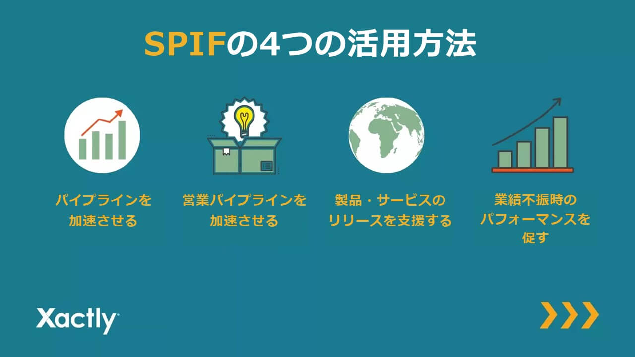 SPIFは必ずしも新製品のリリースのようなポジティブなシナリオに付随するものではありません。売上が芳しくない場面で、売上を大幅に向上させるために取り入れなければならないこともあります。SPIFは、既存の営業報酬プランに加えて、営業意欲を大きく刺激する短期的なインセンティブとして取り入れられるものであり、売上を大きく後押しし、確実に目標達成へと導くことができるのです。