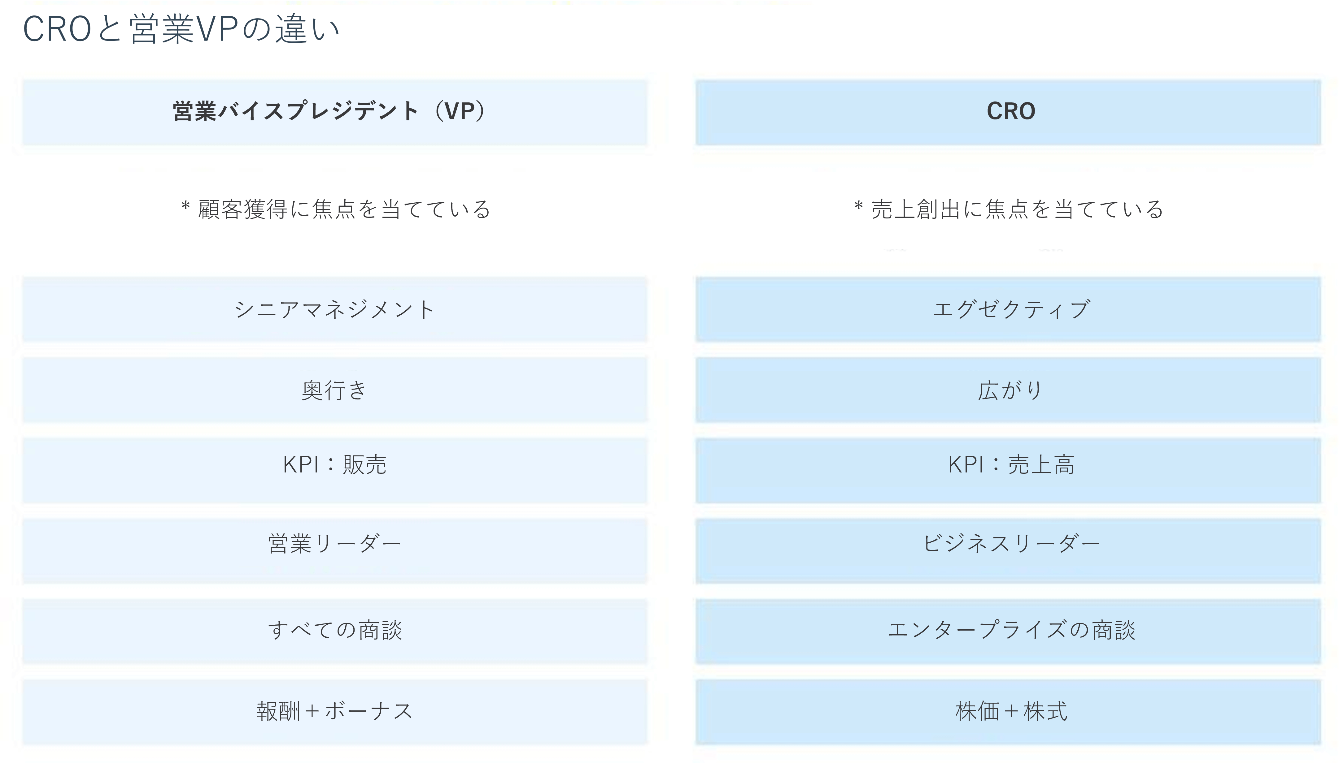 CRO と営業のトップ(ここでは営業バイスプレジデント:営業VPと表記します)を区別することが重要です。CROの役割が広がり一般化するにつれて、従来の営業VPと混同されることが多くなってきました。どちらも売上に注目する役職ですが、機能的には全く異なります。営業VPの役割は、営業部門の監督と戦略が中心です。一方のCROは、部門横断的に売上創出管理・成長アプローチを取り入れる責務を担っています。