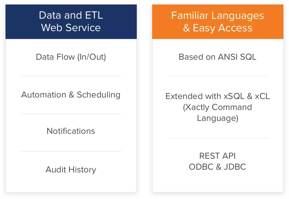 セルフ実装から完全引き渡し型の実装まで、お客様の最適な方法で統合プロセスを管理できます。Xactly ConnectのクエリとELT構文は、ITチームにとって馴染みのあるANSI SQLに基づく一般的な標準言語を使用しているため、プラットフォームについて習得するのに必要な時間を短縮できます。