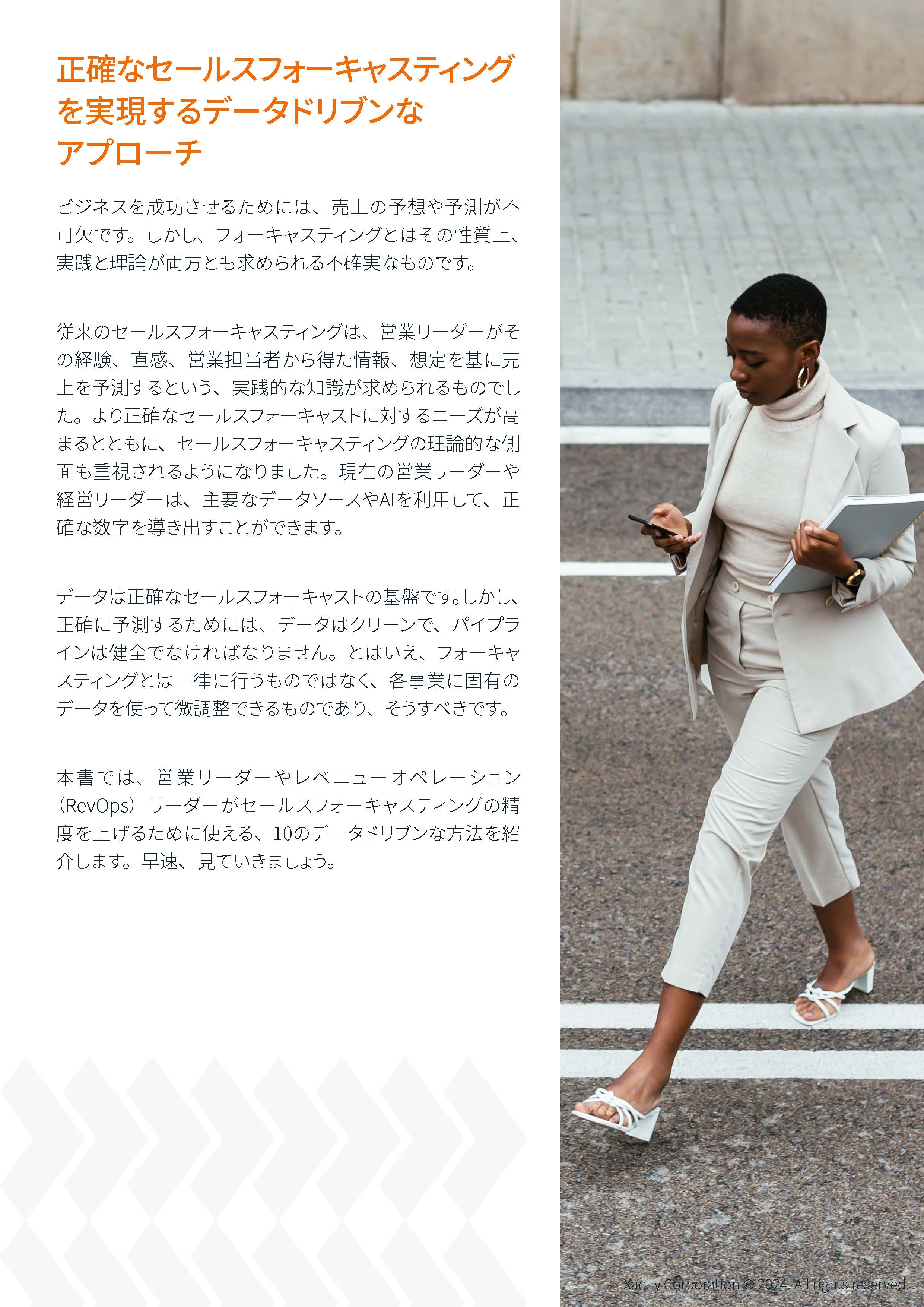 本書では、営業リーダーやレベニューオペレーション(RevOps)リーダーがセールスフォーキャスティングの精度を上げるために使える、10のデータドリブンな方法を紹介します。