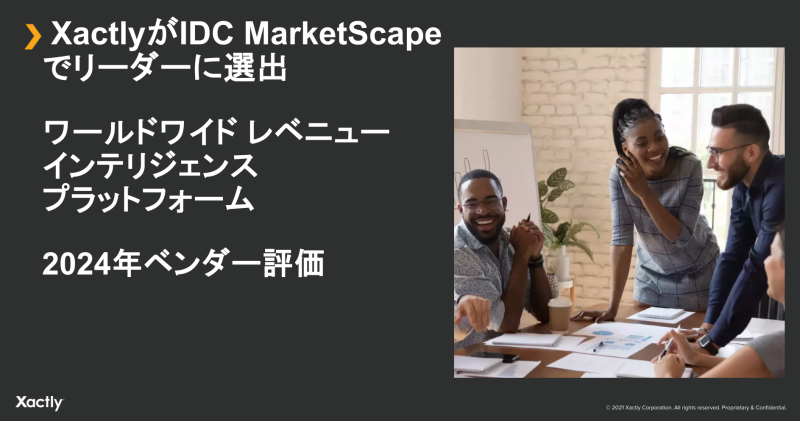 IDC MarketScape「Worldwide Revenue Intelligence Platforms 2024 Vendor Assessment」において、Xactlyがリーダーに選ばれました。IDC MarketScapeレポートは、レベニューインテリジェンス・ソリューションを求めるテクノロジー・バイヤーを支援するために設計されており、この分野のベンダー9社の以下の機能を調査対象とし評価しています。