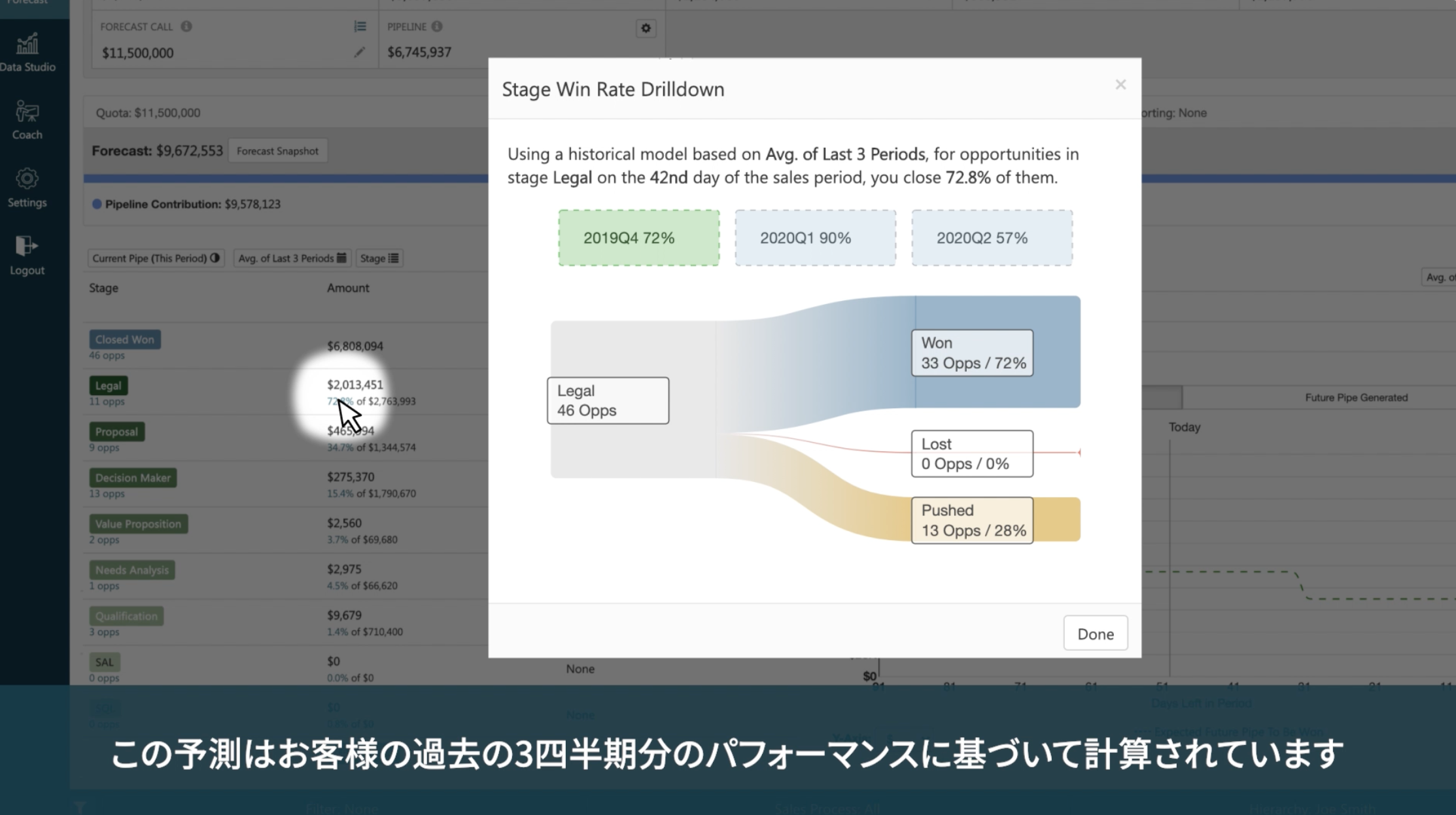 SFA上の商談情報と過去3四半期の実績に基づき、XactlyのAIが確度の高い着地予測を提供
