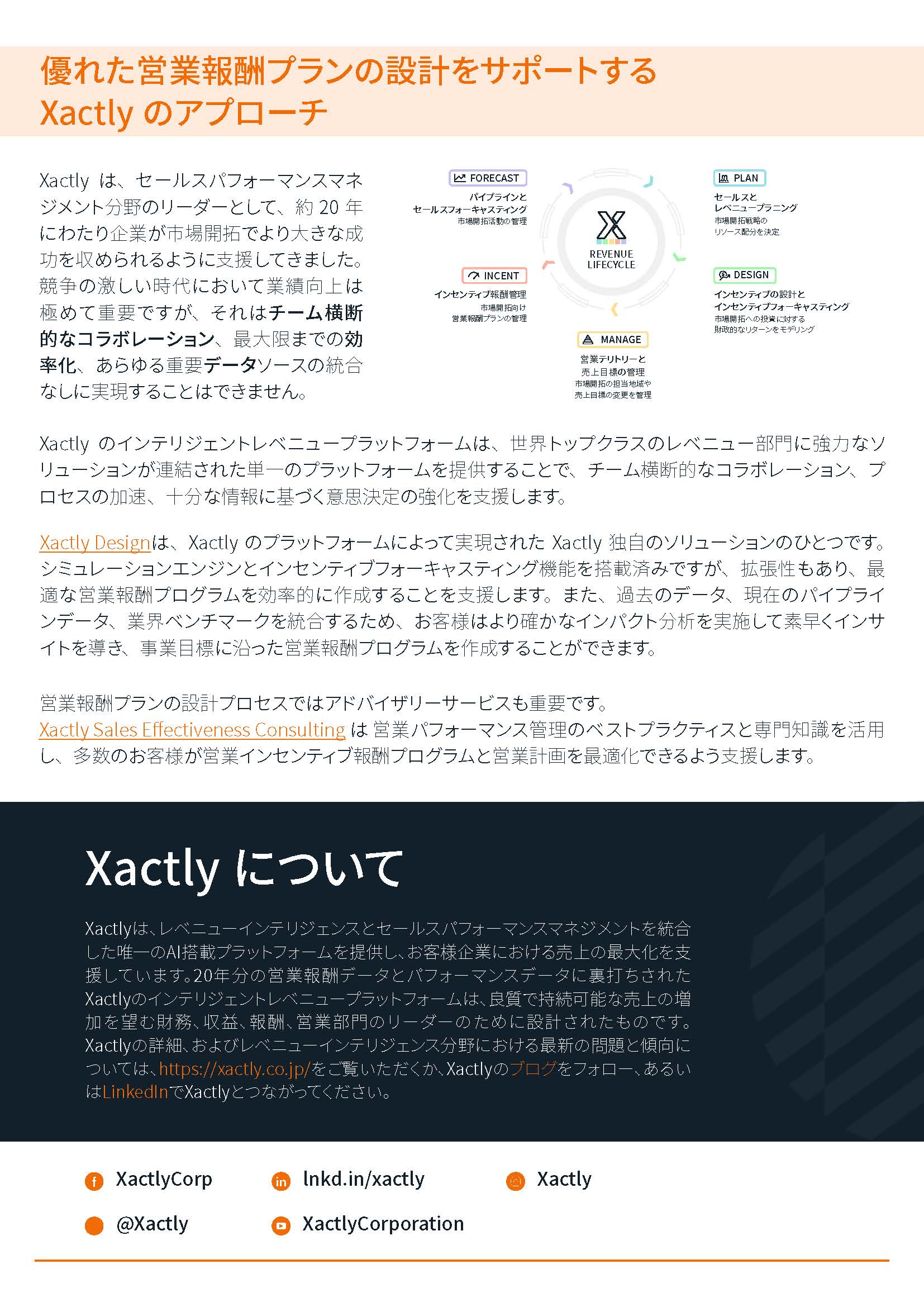 「営業報酬プランの設計で考慮すべきポイント」、「SaaS 事業向けに効果的な営業報酬プランを設計した実例」、「競争力を維持するために採用されているアプローチ」、「統合プラットフォームを通じて最適な営業報酬プランの設計と業績向上をサポートする」、「Xactly のアプローチ」